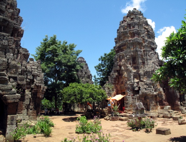 Made up of four temple towers together with a further one in the centre, the original temple Wat Banan dates back to 1050 during the reign of king Udayadityavarman I as a Hindu temple. Later in around 1219, during the reign of king Jayarvarman VII, people used the same stones to rebuild this temple as a Buddhist temple. Laterite which is the most popular material used so much nowadays for bars and hotel receptions in Phnom Penh and Siem Reap is the main material coming with sandstone to build Banan. The towers are undoubtedly impressive and basically  impaired with a light brown sediment rock and lots of small holes within it.