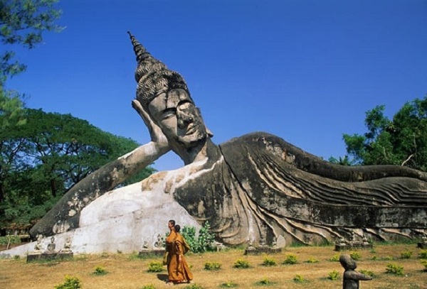Buddha Park (Buddha Park) in Xieng Khuan Park lies 25km southeast Blanket. There are more than 200 statues of Buddhist and Hindu characters made of concrete, featuring giant Buddha statue is 40m long hands. The statue is also the statue in the likeness of men, gods, animals and demons. You can go inside buildings shape the giant pumpkin through a demon’s mouth nearly 3m high and climb the stairs to visit each floor represents hell, earth and heaven. To come here you should go by tuk tuk if crowded, price 70,000 Kip or catch bus No. 45 near the Talat Sao market at 5,000 kip / person, 20-40 minutes a trip. Tickets to the Buddha Park: 5,000 Kip.
