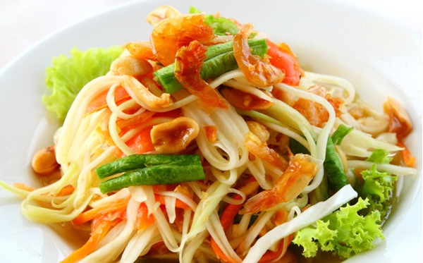 Traditionally, a plate of Thai papaya salad typically will include fibroblasts papaya, beans, cucumber slices, Thai chilies, Thai basil, lime juice and roasted peanuts, chili, garlic crushed …