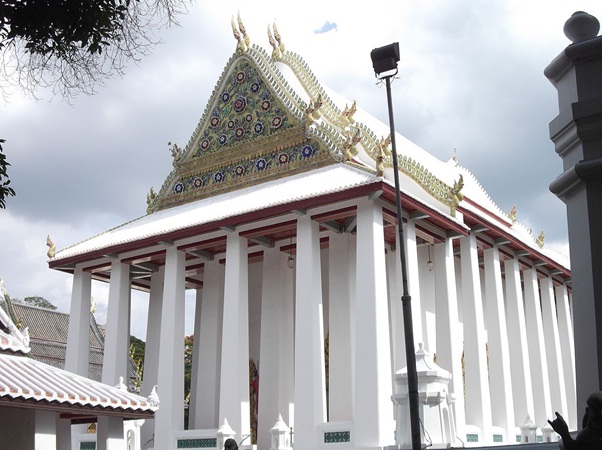 With its beautiful garden, the temple is a delightful haven of greenery which makes a pleasant change from the busy daily life of the capital. The temple is striking for its Chinese-influenced decor of landscapes and dragons. It has a Chinese-style ceramic corrugated roof, embellished with colorful porcelain in Pud-Tan leaves and flowers (or cotton rose) patterns. Chofa (the gable), and Bai Raka (toothlike ridges on the sloping edge of the gable) were adorned with various porcelain designs from China.